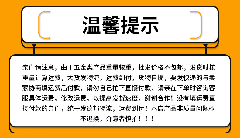 親們請(qǐng)注意,由于五金類產(chǎn)品重量較重,批發(fā)價(jià)格不包郵,發(fā)貨時(shí)按重量計(jì)算運(yùn)費(fèi),大貨發(fā)物流,運(yùn)費(fèi)到付,貨物自提,要發(fā)快遞的與賣家協(xié)商填運(yùn)費(fèi)后付款,請(qǐng)勿自己拍下直接付款,請(qǐng)親在下單時(shí)咨詢客服具體運(yùn)費(fèi),修改運(yùn)費(fèi),以提高發(fā)貨速度,謝謝合作,給您帶來不便,請(qǐng)見諒,謝謝?。。?span style="font-weight: 700;">沒有填運(yùn)費(fèi)直接付款的親們,統(tǒng)一發(fā)德邦物流,運(yùn)費(fèi)到付?。?!