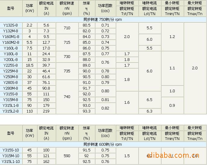 Y系列電動機,額定電壓為380V,額定功率為50HZ,3KW及以下為“Y"接法,4KW及以上為“△”接法。
