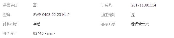 二、SWP-C403-02-23-HL-P具體參數(shù):外形尺寸:96*48mm開孔尺寸:92*45mm不帶通訊 4-20ma輸出,可切換輸入,帶上下限報警、24v饋電輸出。