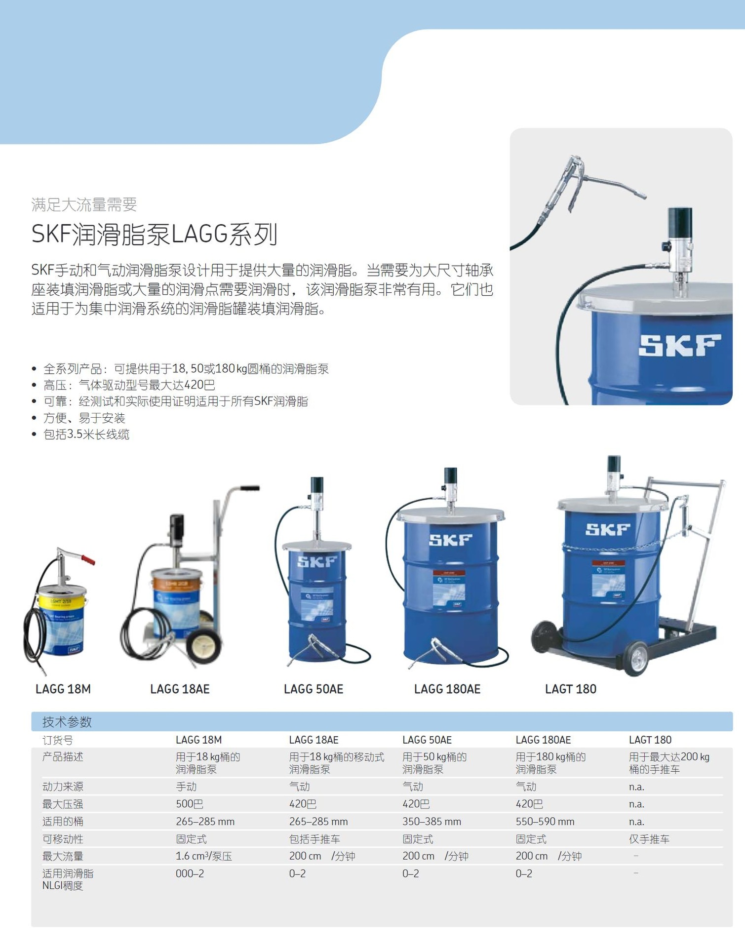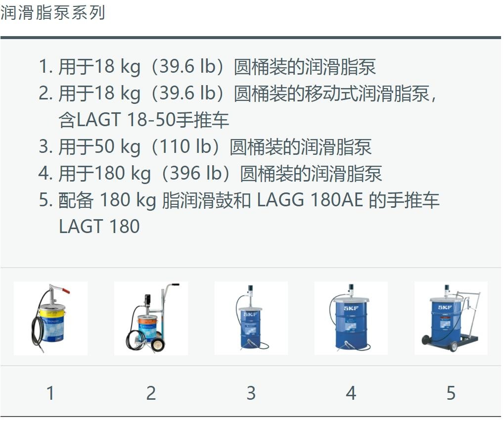 - 全系列產(chǎn)品;可提供用于18、50或180 kg(39、110 或 400 lb)圓桶的潤滑脂泵