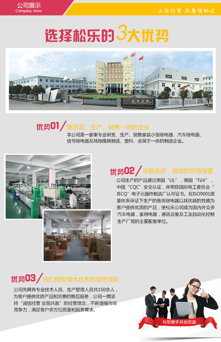 寧波松樂繼電器有限公司是具有二十多年歷史的超小型電磁繼電器制造公司。公司生產(chǎn)的產(chǎn)品通過美國(guó)“UL”,德國(guó)“TüV”,中國(guó)“CQC”安全認(rèn)證,并榮獲國(guó)際電工委員會(huì)“IECQ”電子元器件制造廠認(rèn)可證書。在ISO9001質(zhì)量體系保證下生產(chǎn)的各類繼電器以其優(yōu)越的性能為客戶提供優(yōu)質(zhì)的產(chǎn)品,使松樂公司成為國(guó)內(nèi)外眾多汽車電器,家用電器,通訊設(shè)備及工業(yè)自動(dòng)化控制生產(chǎn)廠商的主要配套單位。司位于東海之濱—浙江遠(yuǎn)東工業(yè)城,占地面積30000平方米,生產(chǎn)廠房50000平方米;擁有四十條設(shè)施