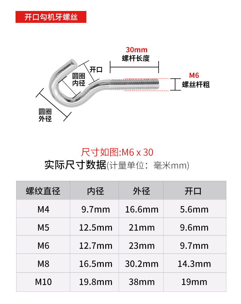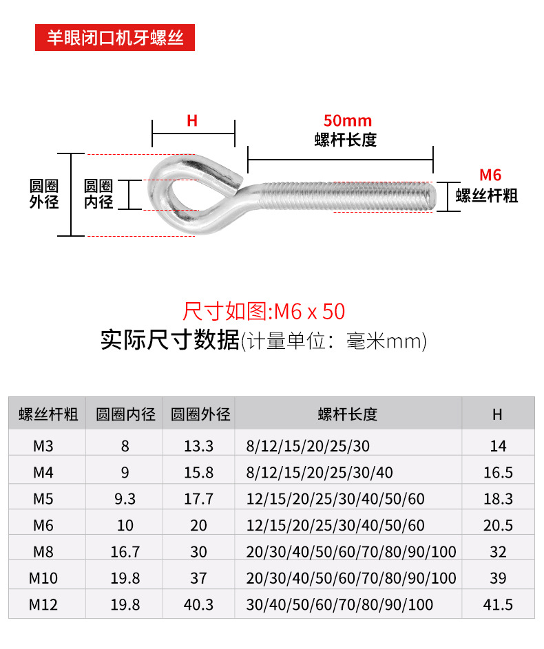 鍍白鋅閉口羊眼機牙螺絲開口問號掛鉤帶圓環(huán)螺栓吊環(huán)螺絲M3-M12