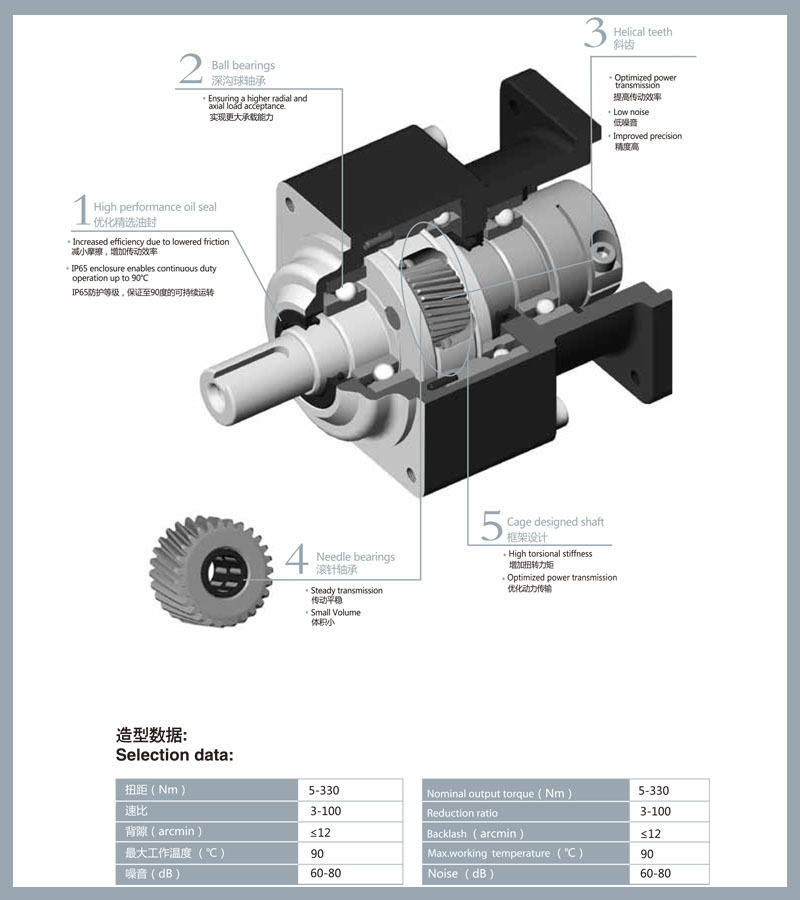 v 相對(duì)其他減速機(jī),行星減速機(jī)具有高剛性,高精度(單級(jí)可做到1分以內(nèi)),高傳動(dòng)效率(單級(jí)在97%-98%),高的 扭矩/體積比,終身免維護(hù)等特點(diǎn).