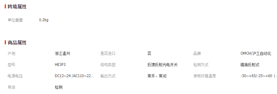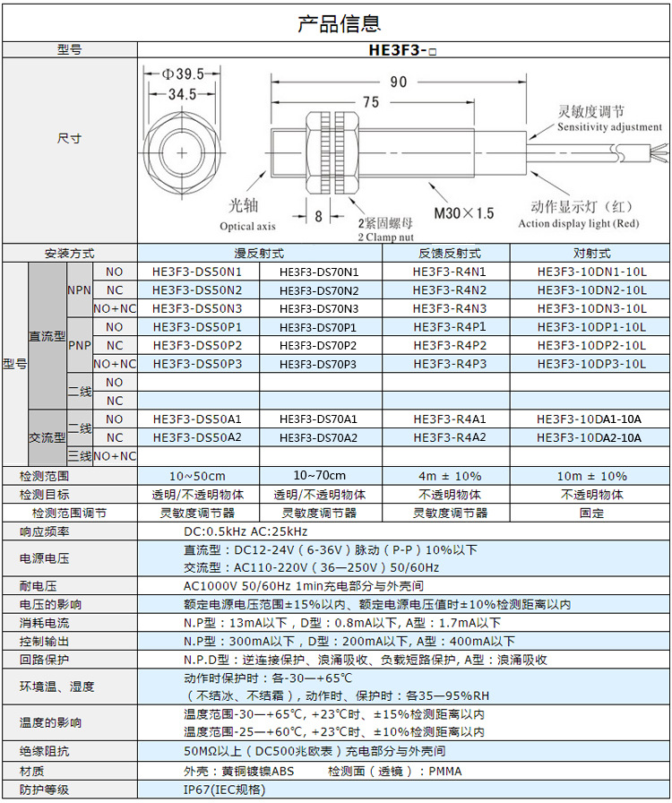 滬工自動化 HE3F3-R4N3(P3/A1/A2)防水光電開關(guān)反饋反射式常開/閉