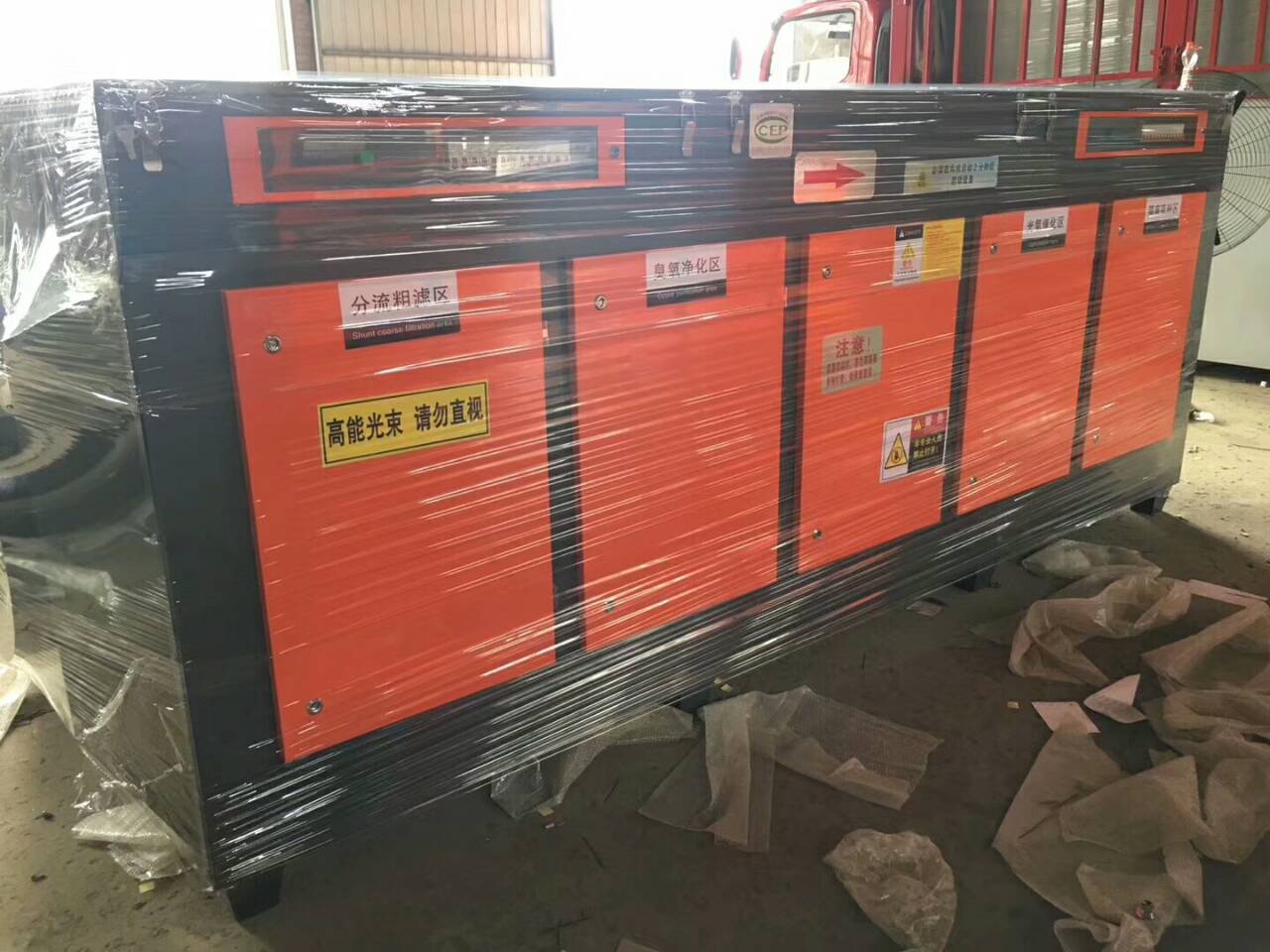 40000風量UV光氧凈化器詳細參數(shù): 數(shù)量:160套U型燈管 功率:24KW 電壓:380V 尺寸:3800*1825*1320mm 外廂材質(zhì):1.5mm碳鋼(可訂做201/304不銹鋼的) 光氧廢氣凈化器利用高臭氧UV紫外線光束分解空氣中的氧分子產(chǎn)生游離氧,即活性氧,因游離氧所攜正負電子不平衡所以需與氧分子結(jié)合,進而產(chǎn)生臭氧。 光氧廢氣凈化器的工作原理:有足夠的能量來產(chǎn)生自由基,引發(fā)一系列復雜的物理、化學反應(yīng)。由臭氧發(fā)生器作用引起的氣體有機物化學反應(yīng)是在氣相中進行的電離、離解、激發(fā)、原子,分子間的相互結(jié)合及加成反應(yīng)。這個能量足以使大多數(shù)氣態(tài)有機物中的化學鍵發(fā)生斷裂,從而使其降解。從凈化空氣效率考慮,我們選擇了-C波段紫外線和臭氧發(fā)生器結(jié)合電暈電流較高化裝置采用脈沖電暈放吸附技術(shù)相結(jié)合的原理對有害氣體進行消除,其中-C波段紫外線主要用來去除硫化氫、氨、苯、甲苯、二甲苯、甲醛、丙酮、尿烷、樹脂、等氣體及消毒。 光氧催化凈化器除味機理 (1)光解 光氧催化有機廢氣凈化器內(nèi)布置有數(shù)個紫外光器陳列,含有毒和異味高分子的煙氣進入光化學餐飲油煙除味器時,這些高分子物質(zhì)在強烈紫外線照射下快速光解,分子鏈斷裂,分解為小分子基因。 (2)氧化 分解后的小分子基團在特定頻率的光和光觸媒的催化下與空氣中的氧發(fā)生氧化反應(yīng)生成無毒無害的小分子物質(zhì);同時,空氣量的氧也在紫外光照射的催化下反應(yīng)成臭氧,臭氧分子具有強氧化性,可將油煙廢氣中被分解后中分子基因氧化,生成無臭無害的小分子物質(zhì),從而使異味大大衰減或者完全消失。 UV光氧催化廢氣凈化器的產(chǎn)品特點: 1、有效除惡臭:能有效去除揮發(fā)性有機物(VOC)、無機物類等主要污染物,以及各種惡臭味,脫臭效率可達99%以上,脫臭效果大大超過1993年頒布的惡臭污染物排放標準(GB14554-93). 2、無需添加任何物質(zhì):只需要設(shè)置相應(yīng) 的排風管道和排風動力,使惡臭氣體通過本設(shè)備進行脫臭分解凈化,無需添加任何物質(zhì)參與化學反應(yīng)。 3、適應(yīng)性強:可適應(yīng)高濃度,大氣量,不同惡臭氣體物質(zhì)的脫臭凈化處理,可每天24小時連續(xù)工作,運行穩(wěn)定可靠。 4、運行成本低:本設(shè)備無任何機械動作,無噪音,無需專人管理和日常維護,只需作定期檢查,本設(shè)備能耗低,(每處理1000立方米/小時,
