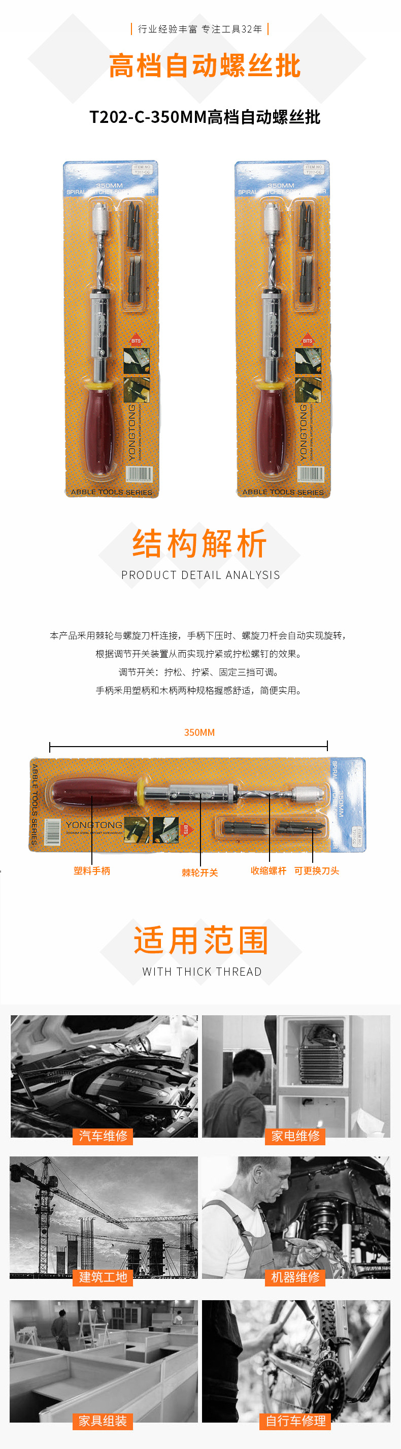 本產品采用棘輪與螺旋刀桿連接,手柄下壓時,螺旋刀桿會自動實現(xiàn)旋轉,根據(jù)調節(jié)開關裝置從而實現(xiàn)擰緊或者擰松螺絲釘的效果,適用于各場合作業(yè)!如有不會使用或者不明白設計原理的客戶可以找客服索要使用視頻哦~~~