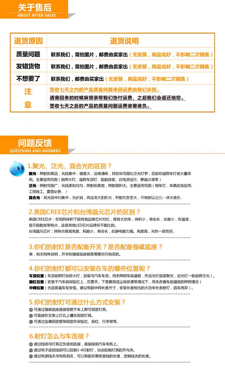 . 所有LED工作燈、LED長條燈均采用美國進口科瑞(CREE LED)芯片或臺灣晶元燈珠。