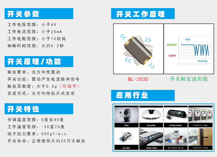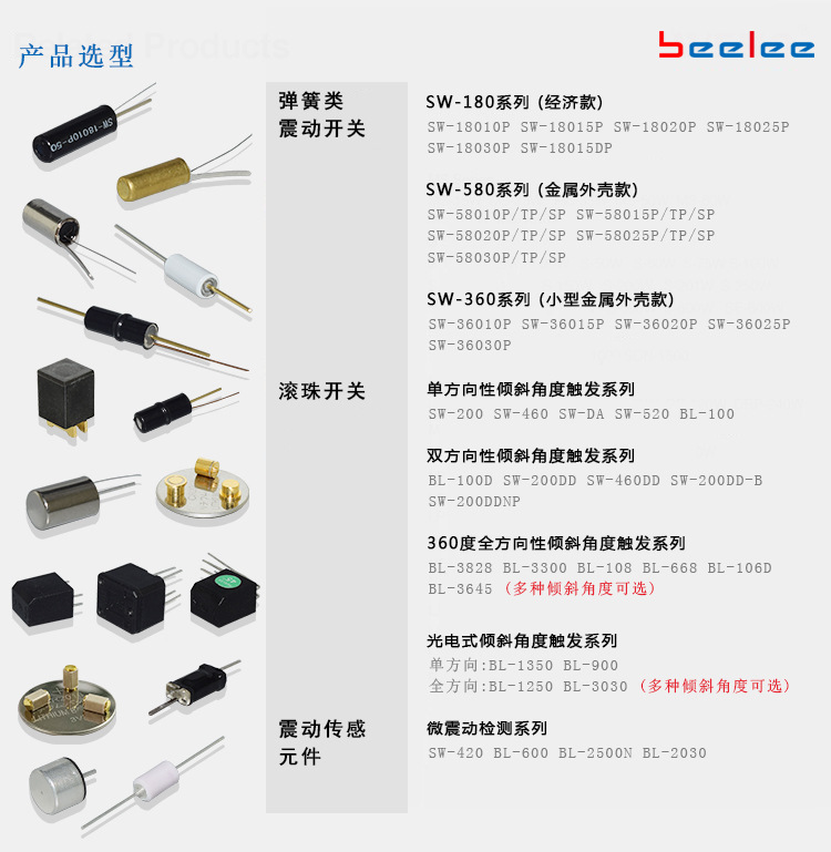 >產(chǎn)品供應(yīng)> HVAC汽車(chē)>汽車(chē)電子電器>開(kāi)關(guān)>BL-2030 全方向振動(dòng)感應(yīng) GPS定位移動(dòng)偵測(cè) 微型貼片震動(dòng)傳感開(kāi)關(guān) 光電式角度傾斜傳感開(kāi)關(guān) 滾珠角度傾斜感應(yīng)開(kāi)關(guān) 精密震動(dòng)傳感元件 震動(dòng)/振動(dòng)開(kāi)關(guān) 干簧管系列 霍爾傳感元件系列 水銀開(kāi)關(guān)系列 …