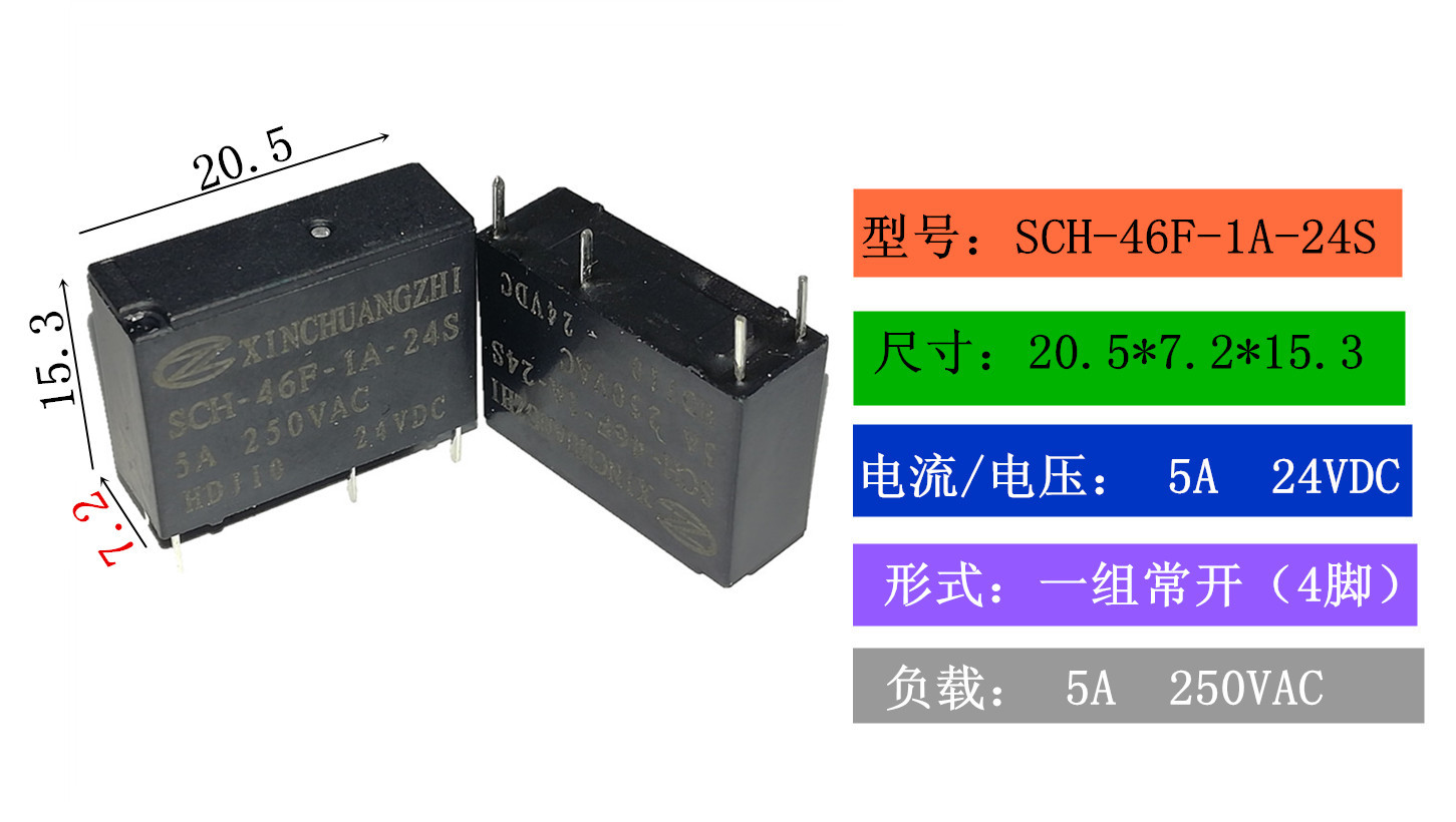 小型電磁繼電器供應(yīng) ,電流可達(dá)5A  ,工廠直銷xinchuangzhi信創(chuàng)智SCH-46F-1A-24S 24VDC 5A 250VAC繼電器 ,觸點(diǎn)負(fù)載5A 250VAC /5A 28VDC  。繼電器的外形尺寸:長(zhǎng)*寬*高-20.0*7.0*12.5,線圈功率為:0.2W  ;通訊設(shè)備,安防專用 變頻器繼電器