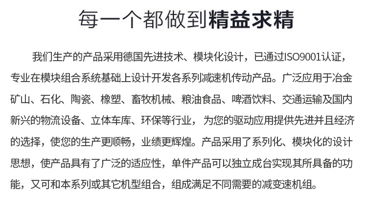 6、經(jīng)過精密加工,構(gòu)成了斜齒輪、傘齒輪、錐齒輪傳動總成的減速機(jī)配置各種類電機(jī),形成機(jī)電一體化,保證了產(chǎn) 品使用質(zhì)量特征。