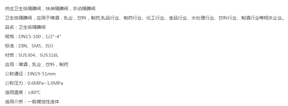 本網(wǎng)頁(yè)所展示的有關(guān)【供應(yīng)衛(wèi)生級(jí)隔膜閥 衛(wèi)生級(jí)快裝隔膜閥 不銹鋼手動(dòng)隔膜閥 溫州產(chǎn)隔膜閥_閥門_溫州經(jīng)濟(jì)技術(shù)開(kāi)發(fā)區(qū)沙城一川閥門管件加工廠】的信息/圖片/參數(shù)等由全球零部件網(wǎng)的會(huì)員【溫州經(jīng)濟(jì)技術(shù)開(kāi)發(fā)區(qū)沙城一川閥門管件加工廠】提供,由全球零部件網(wǎng)會(huì)員【溫州經(jīng)濟(jì)技術(shù)開(kāi)發(fā)區(qū)沙城一川閥門管件加工廠】自行對(duì)信息/圖片/參數(shù)等的真實(shí)性、準(zhǔn)確性和合法性負(fù)責(zé),本平臺(tái)(本網(wǎng)站)僅提供展示服務(wù),請(qǐng)謹(jǐn)慎交易,因交易而產(chǎn)生的法律關(guān)系及法律糾紛由您自行協(xié)商解決,本平臺(tái)(本網(wǎng)站)對(duì)此不承擔(dān)任何責(zé)任。您在本網(wǎng)頁(yè)可以瀏覽【供應(yīng)衛(wèi)生級(jí)隔膜閥 衛(wèi)生級(jí)快裝隔膜閥 不銹鋼手動(dòng)隔膜閥 溫州產(chǎn)隔膜閥_閥門_溫州經(jīng)濟(jì)技術(shù)開(kāi)發(fā)區(qū)沙城一川閥門管件加工廠】有關(guān)的信息/圖片/價(jià)格等及提供【供應(yīng)衛(wèi)生級(jí)隔膜閥 衛(wèi)生級(jí)快裝隔膜閥 不銹鋼手動(dòng)隔膜閥 溫州產(chǎn)隔膜閥_閥門_溫州經(jīng)濟(jì)技術(shù)開(kāi)發(fā)區(qū)沙城一川閥門管件加工廠】的商家公司簡(jiǎn)介、聯(lián)系方式等信息。