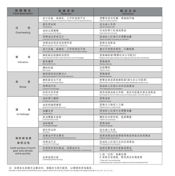 3.使用過程中發(fā)生不正常情況時(shí),應(yīng)及時(shí)停機(jī)檢查,可參照“故障原因及解決辦法”表處理。(減速機(jī)的油溫最高允許達(dá)到95℃,在此溫度界限下,只要油溫不再上升,可以放心使用)。