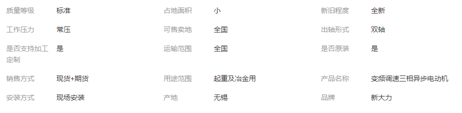 立即發(fā)布求購意向本網(wǎng)頁所展示的有關(guān)【新大力 三相異步電動機 YZP132M2-6-4.0KW 使用便捷 堅固耐用_驅(qū)動電機_無錫新大力電機有限公司】的信息/圖片/參數(shù)等由全球零部件網(wǎng)的會員【無錫新大力電機有限公司】提供,由全球零部件網(wǎng)會員【無錫新大力電機有限公司】自行對信息/圖片/參數(shù)等的真實性、準(zhǔn)確性和合法性負(fù)責(zé),本平臺(本網(wǎng)站)僅提供展示服務(wù),請謹(jǐn)慎交易,因交易而產(chǎn)生的法律關(guān)系及法律糾紛由您自行協(xié)商解決,本平臺(本網(wǎng)站)對此不承擔(dān)任何責(zé)任。您在本網(wǎng)頁可以瀏覽【新大力 三相異步電動機 YZP132M2-6-4.0KW 使用便捷 堅固耐用_驅(qū)動電機_無錫新大力電機有限公司】有關(guān)的信息/圖片/價格等及提供【新大力 三相異步電動機 YZP132M2-6-4.0KW 使用便捷 堅固耐用_驅(qū)動電機_無錫新大力電機有限公司】的商家公司簡介、聯(lián)系方式等信息。