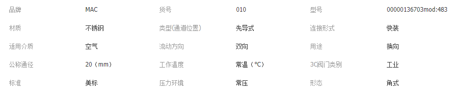 美國MAC成立于1948年,擁有70多項(xiàng)專利技術(shù),專業(yè)設(shè)計(jì)制造高性能的空壓電磁閥。MAC電磁閥以速度快、重復(fù)度高、環(huán)境耐受性強(qiáng)而著稱.