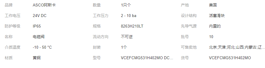 有售ASCO防爆電磁閥VCEFCMG531H402MO DC24V三位五通寧:18964024669(同微信)QQ: 2880626089ASCO防爆電磁閥的閥蓋和罩帽等是封閉的,其作用有兩種:一種僅僅是為了保護(hù)內(nèi)部零件,防止外界塵埃等雜物的侵入,不要求作氣密性試驗(yàn),另一種是為了防止有毒、易燃等類介質(zhì)的溢出,