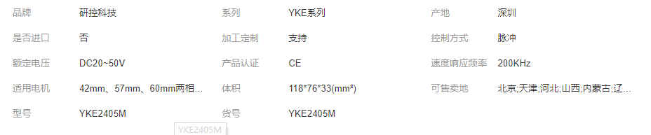 >產(chǎn)品供應(yīng)>家電行業(yè)>電機(jī)>研控YKE2405M系列脈沖新一代兩相開(kāi)環(huán)步進(jìn)驅(qū)動(dòng)器高精度開(kāi)環(huán)電機(jī) 驅(qū)動(dòng)器、控制器、控制卡、控制系統(tǒng)的生產(chǎn)(僅限分公司經(jīng)營(yíng));步進(jìn)和伺服電機(jī)、驅(qū)動(dòng)器、控制器、控制卡、控制系統(tǒng)軟件集成的…